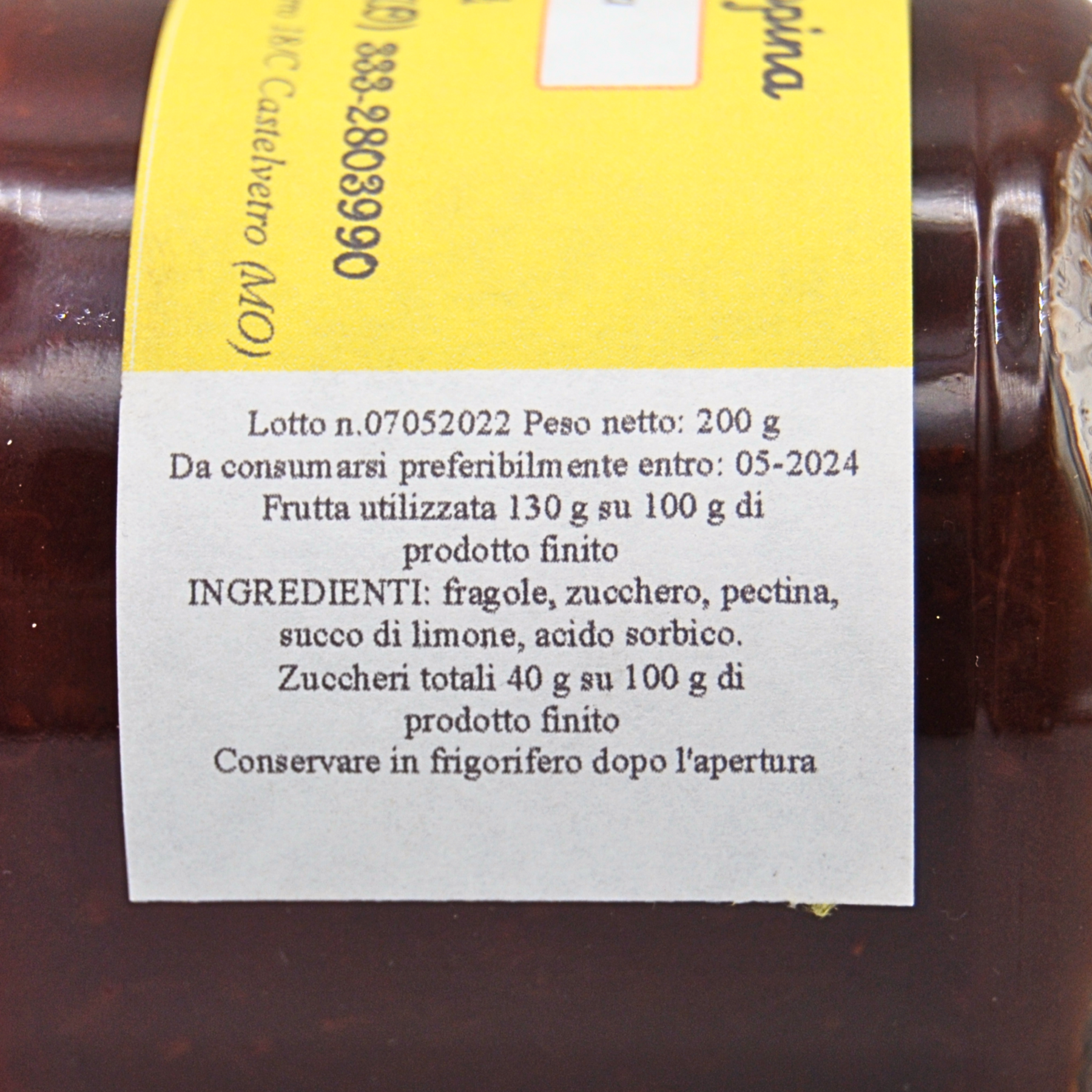Ingredienti: fragole, zucchero, succo di limone, acido ascorbico, pectina (zuccheri totali 40 gr. su 100 gr. di prodotto finito - frutta utilizzata 130 gr. ogni 100 gr. di prodotto finito)